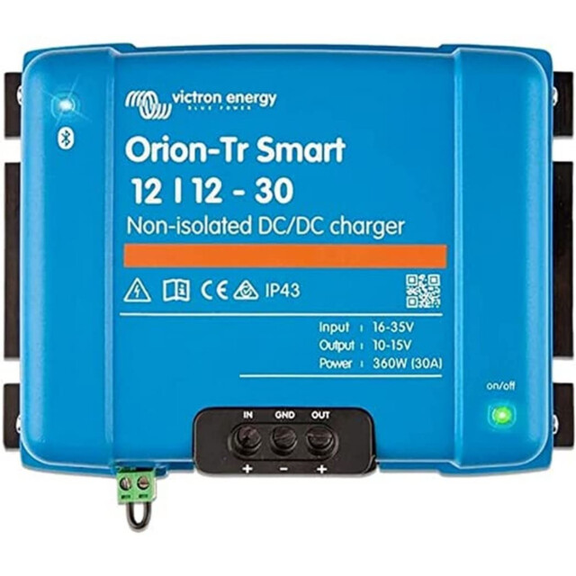 O carregador de bateria Victron Orion-Tr Smart 12/12-30A (360W) DC-DC é um carregador de bateria avançado de três etapas DC/DC com saídas isoladas e funcionalidade Bluetooth integrada.