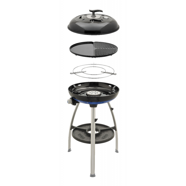 Grelhador redondo 47cm, com pernas de alumínio, tampa com termómetro e isqueiro piezo. Inclui saco para transporte, grelha para funcionar como fogão e 1 grelha para carne/peixe/legumes (metade prato, metade grelha)